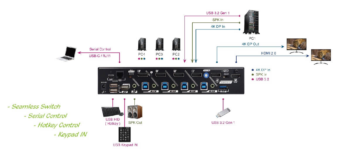 Switched between multiple computing devices (desktop, laptop,mac), USB devices, Nintendo Switch, SONY PS4/PS5, Xbox One, webcams, or other peripheral devices.